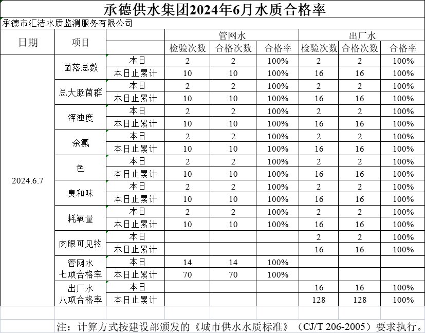 承德供水集團(tuán)2024年6月7日水質(zhì)合格率