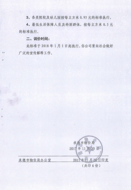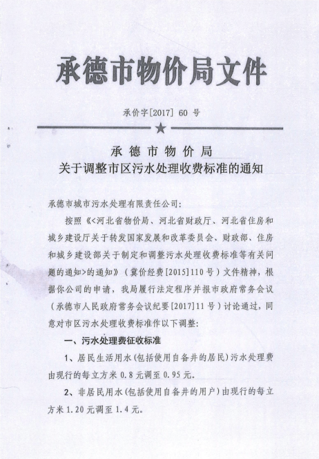 《承德市物價局關于調(diào)整市區(qū)污水處理收費標準的通知》承價字【2017】60號