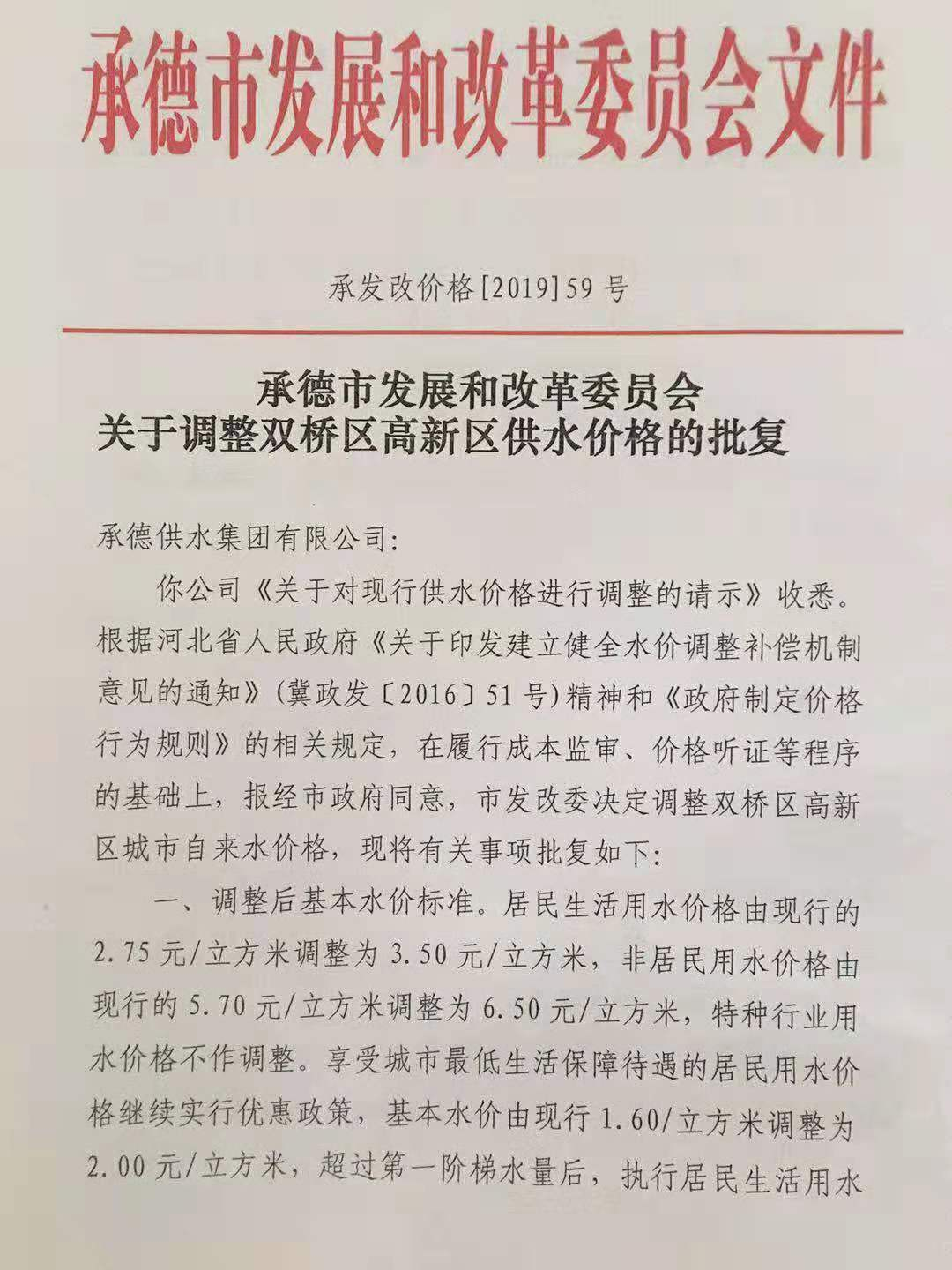 承德市發(fā)展和改革委員會關(guān)于調(diào)整雙橋區(qū)高新區(qū)供水價格的批復 承發(fā)改價格【2019】59號